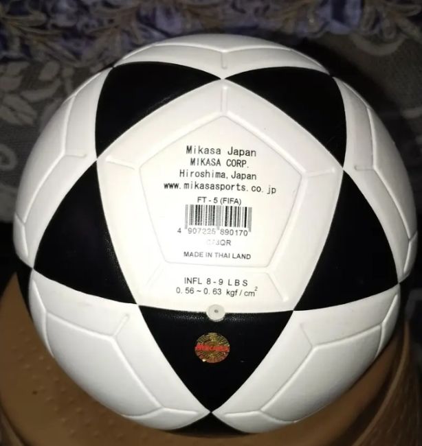 تُظهر الصورة كرة قدم من نوع ميكاسا (Mikasa)، وتحديداً موديل FT-5 المعتمد من الفيفا (FIFA) والمصنوع في تايلاند. يتميز هذا الموديل بتصميمه التقليدي المكون من مثلثات سوداء وبيضاء، وهو معروف بمتانته العالية ومقاومته للماء، مما يجعله مناسباً للمباريات الرسمية والتدريبات على مختلف أنواع الملاعب.