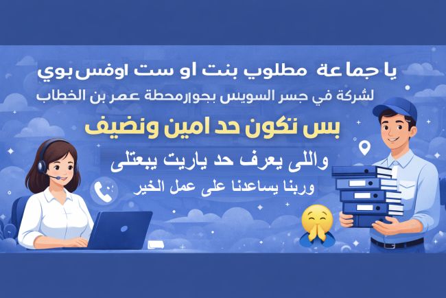 لو سمحتوا يا جماعة مطلوب بنت او ست اوفس بوى لشركة فى جسر السويس بجوار محطة مترو عمر بن الخطاب